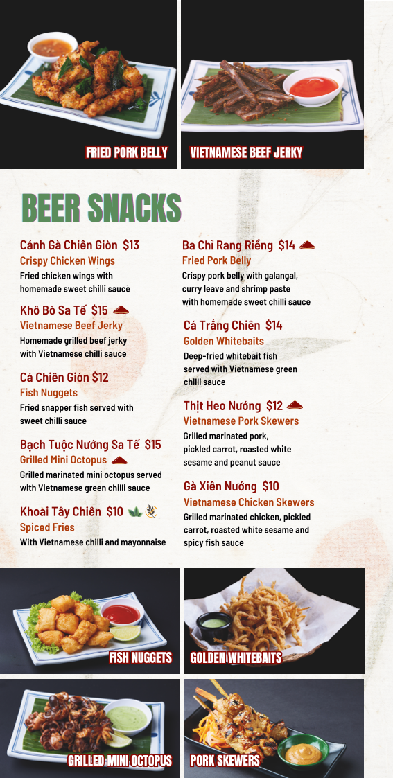 Fresh spring rolls and savory dishes like shaking beef and braised pork belly provide satisfying flavors without being heavy, suited for sharing or a light meal. The selection of cocktails and local beers, including Heineken and inventive options like the Exotic Star, fit well with the bar’s vibrant yet comfortable vibe, especially during happy hour or a lively night out.